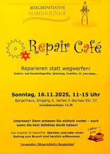 Unter dem Motto: Reparieren statt Wegwerfen! findet das letzte Repair-Café der Bürgerinitiative in diesem Jahr statt. Liebgewonnene Elektro- und Haushaltsgeräte,… - Burgholzhof-Treff / Nachbarschaftscafé