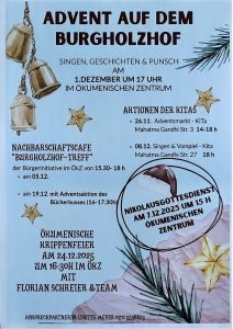 Ab dem 10. Oktober 2025 wird der Burgholzhof-Treff / das Nachbarschaftscafé im Ökumenischen Zentrum von 15:30 Uhr bis 18:00 Uhr… - Neue Informationstafel am Burgholzhof wird eingeweihtEine neue Informationstafel am Aussichtsturm (Auerbachstr. 200) wird am 1. Oktober 2025 um 17 Uhr feierlich eingeweiht. Die Tafel soll…