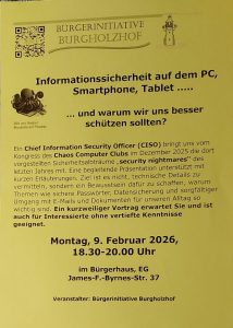 Am Montag, 9. Februar 2026, 18.30-20.00 Uhr veranstaltet die Bürgeriniative Burgholzhof im Bürgerhaus einen Vortrag zur Informationssicherheit, der für Jung… - Auch in diesem Jahr freuen wir uns, Sie an diesen Nachmittagen im Ökumenischen Zentrum auf dem Burgholzhof, Mahatma-Gandhi-Straße 7, zu begrüßen.