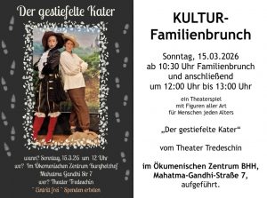 - Das Theater Tredeschin wird am Sonntag, dem 15.03.2026, ab 12:00 Uhr nach dem Familienbrunch im ÖkZ das Märchen „Der gestiefelte Kater“ aufführen, ein Theaterspiel mit Figuren aller Art.