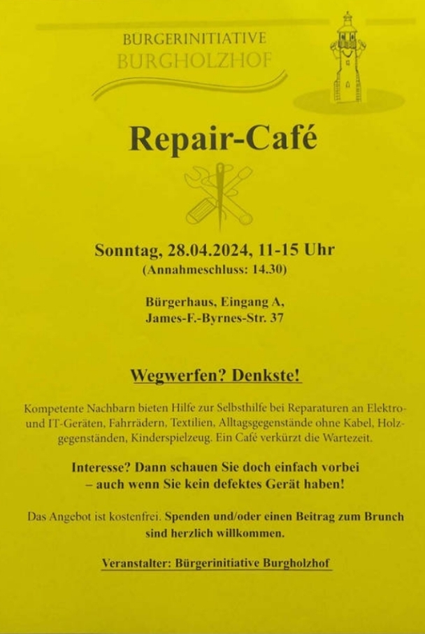 Kompetente Nachbarn bieten Hilfe zur Selbsthilfe bei Reparaturen an von Elektro- und IT-Geräten, Fahrrädern, Textilien, Alltagsgegenständen ohne Kabel, Holzgegenständen und Kinderspielzeug. Ein Café verkürzt die Wartezeit.