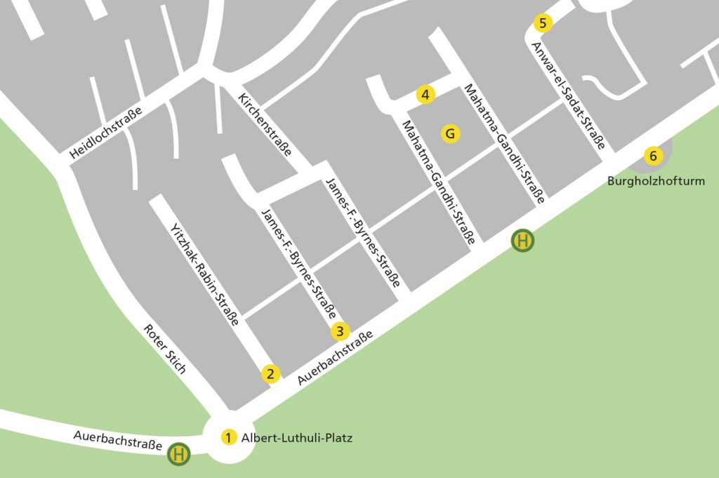 1 Albert-Luthuli-Platz 2 Yitzhak-Rabin-Straße 3 James-F.-Byrnes-Straße 4 Mahatma-Gandhi-Straße 5 Anwar-el-Sadat-Straße 6 Burgholzhofturm (Wahrzeichen des Stadtteils) G Mahatma-Gandhi-Büste