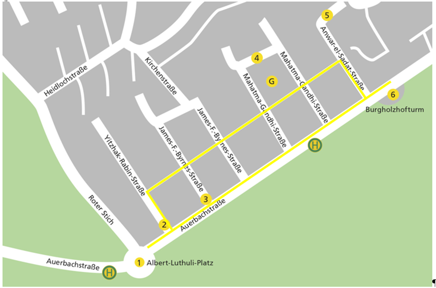 1 Albert-Luthuli-Platz 2 Yitzhak-Rabin-Straße 3 James-F.-Byrnes-Straße 4 Mahatma-Gandhi-Straße